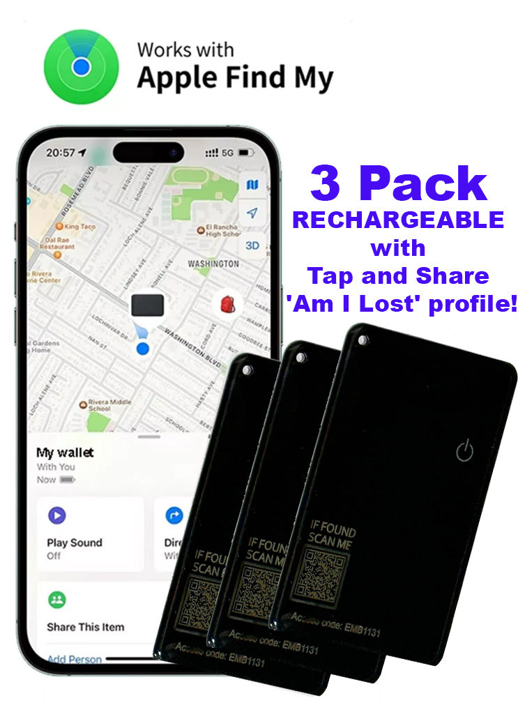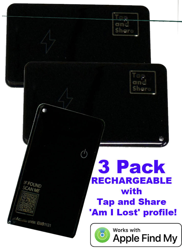 Tap and Share 2-In-1 SmartTrack iCard with 'Am I Lost' - Wallet Tracker (Rechargeable battery) | 3-Pack - WORKS WITH THE APPLE® FIND MY™ APP (Black)