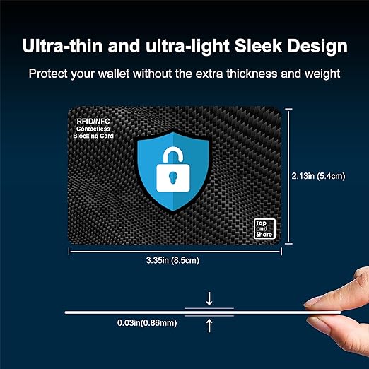 - Ultra-Slim Design: Our smart NFC & RFID Blocking card boasts a credit card-sized, ultra-thin profile that effortlessly fits into your wallet's card slot. It's discreet and won't add bulk to your wallet, eliminating the need for cumbersome sleeves.
